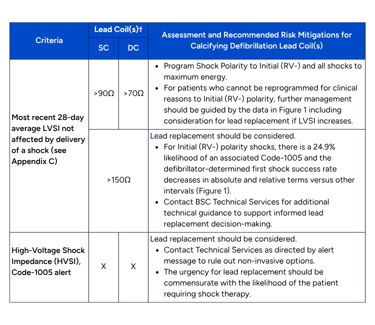 - In patients who cannot be programmed to initial (RV-) shock polarity, but exhibit gradual rise to LVSI of >90 ohms for SC and >70 ohms for DC leads, clinicians should have a discussion with Boston Scientific Technical Services, and consider initiating shared decision making for potential future lead replacement if impedance continues to rise.